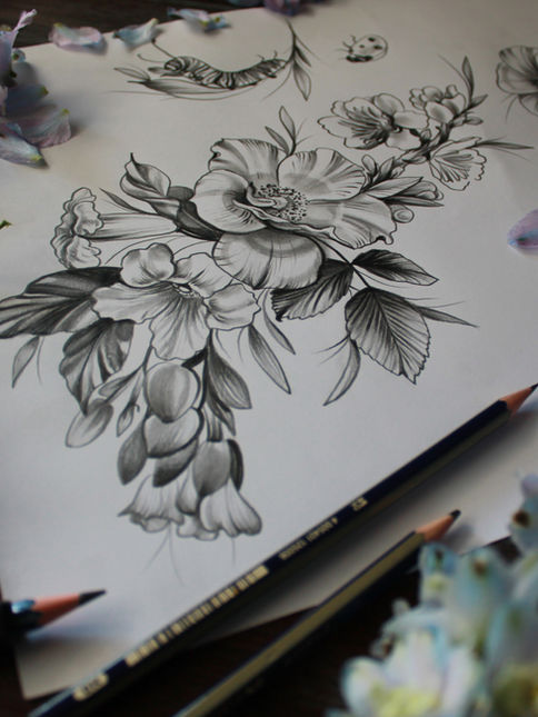 I work as a freelance creative, specializing in commissioned drawings, handcrafted illustrations and custom tattoo designs.